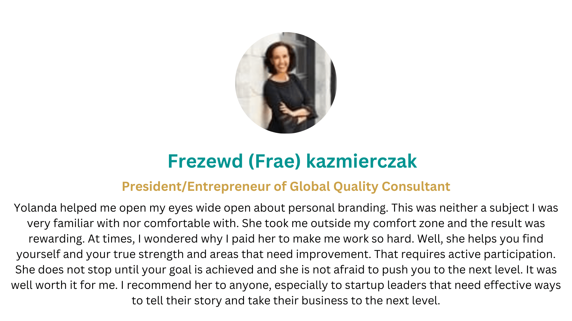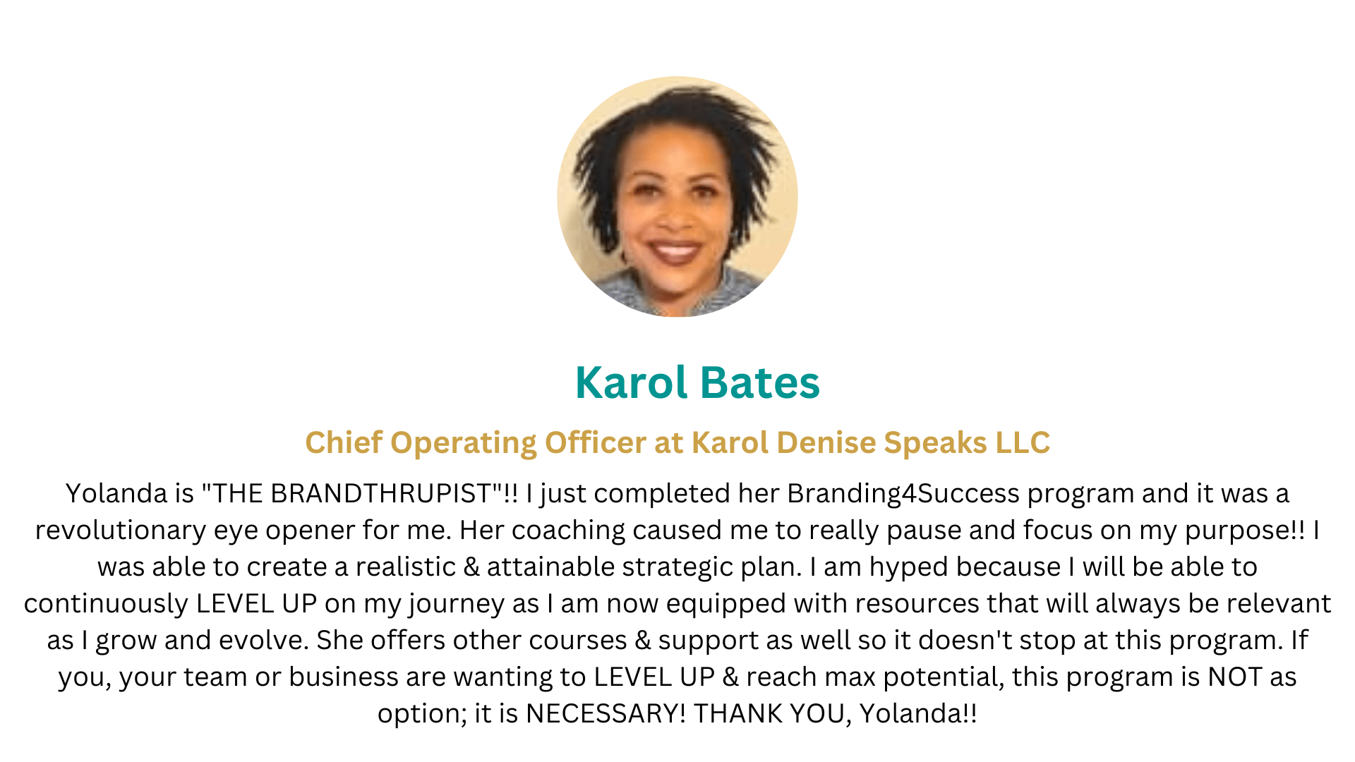Hey, it's Yolanda, the Brandthrupist® and founder of Branding 4 Success, LLC. I'm here to support you on your journey to developing a powerful personal brand and achieving sustainable success. With my decades of corporate experience in marketing, business development, and client engagement, I have helped thousands of individuals like you amplify their brand for increased visibility, influence, and recognition. You can learn from my mistakes and go further faster because I was born to break barriers and prove that when powered by purpose, people are unstoppable.